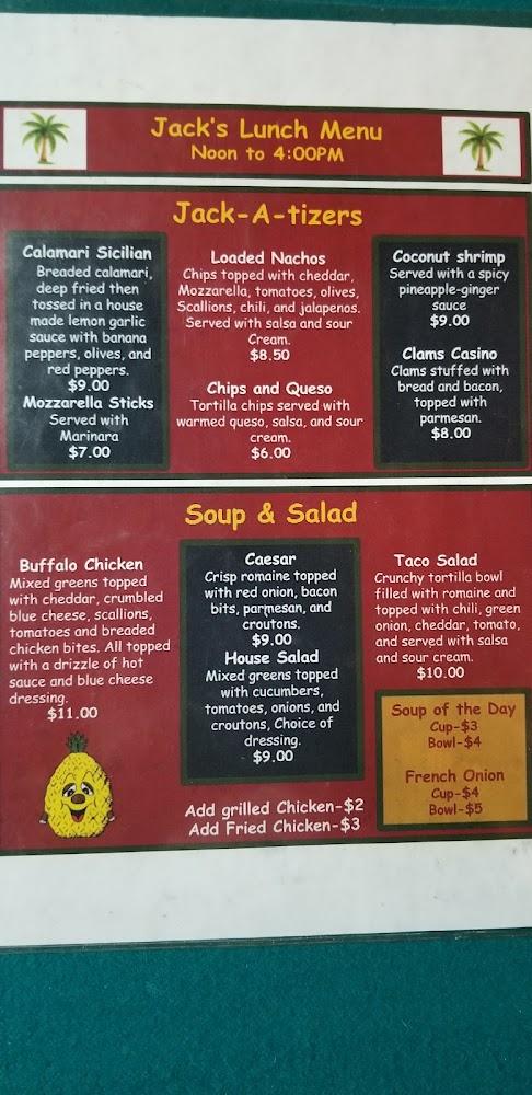 Pineapple Jack's menu features a mix of classic American comfort foods at reasonable prices. The appetizer section includes favorites like chicken wings and fried pickles, all around $8 to $9. Sandwiches like the Reuben or bacon double burger offer a hearty meal, typically around $10. Signature dishes like fish and chips find their way into being crowd-pleasers. A diverse selection of drinks complements the food perfectly, with an array of beers and cocktails to choose from. The layout is casual, making sharing dishes easy and enjoyable for large groups. Pineapple Jack's keeps it simple yet delicious, honoring classic flavors beloved by many.